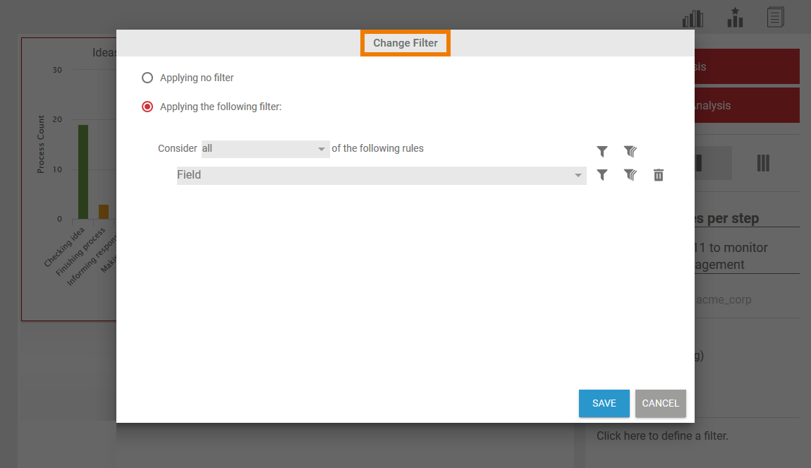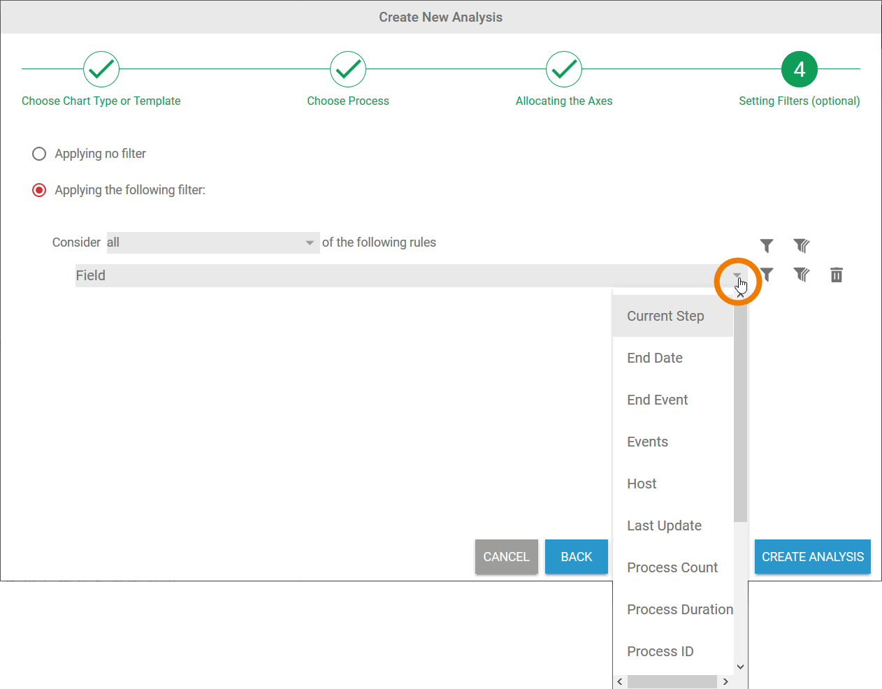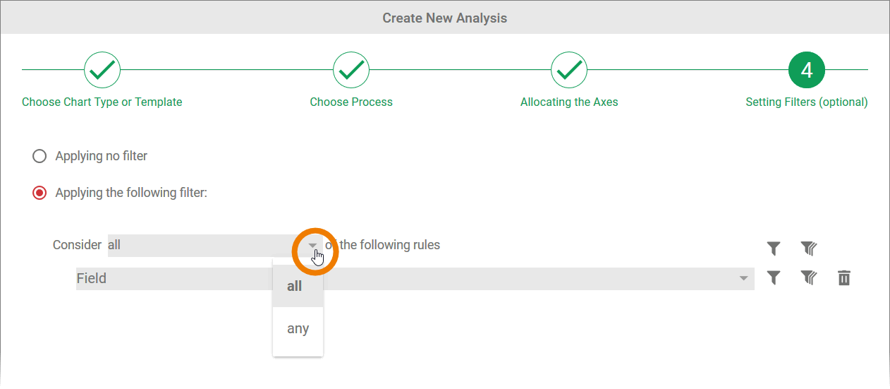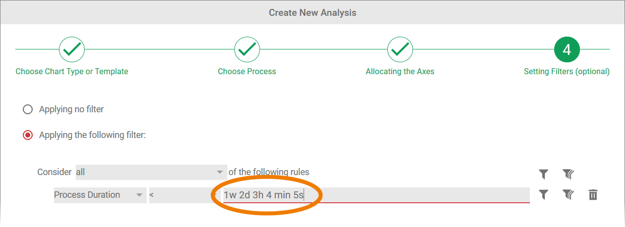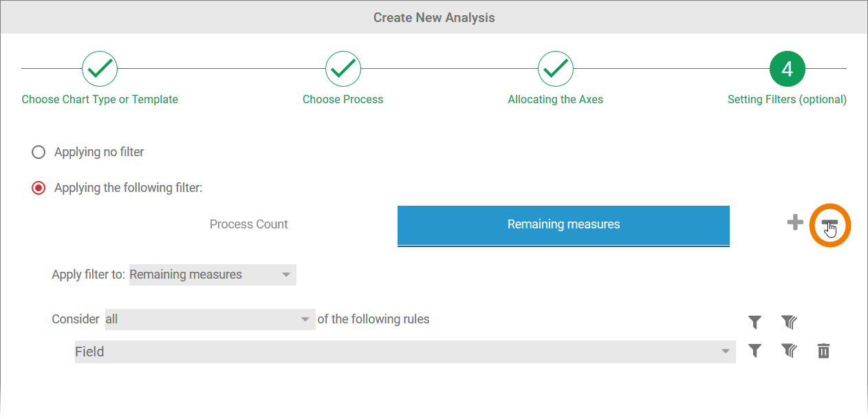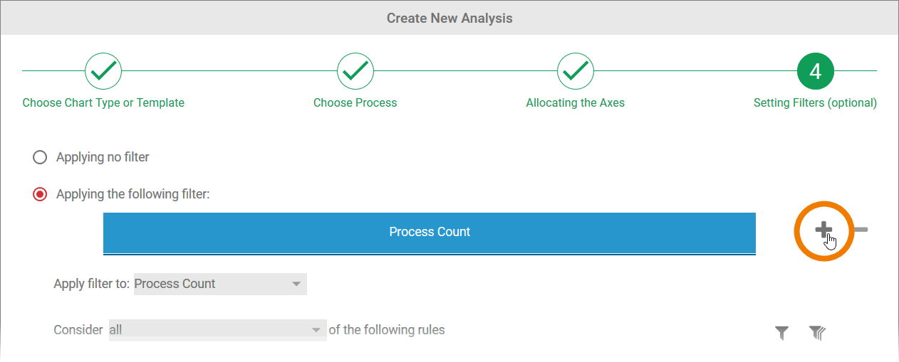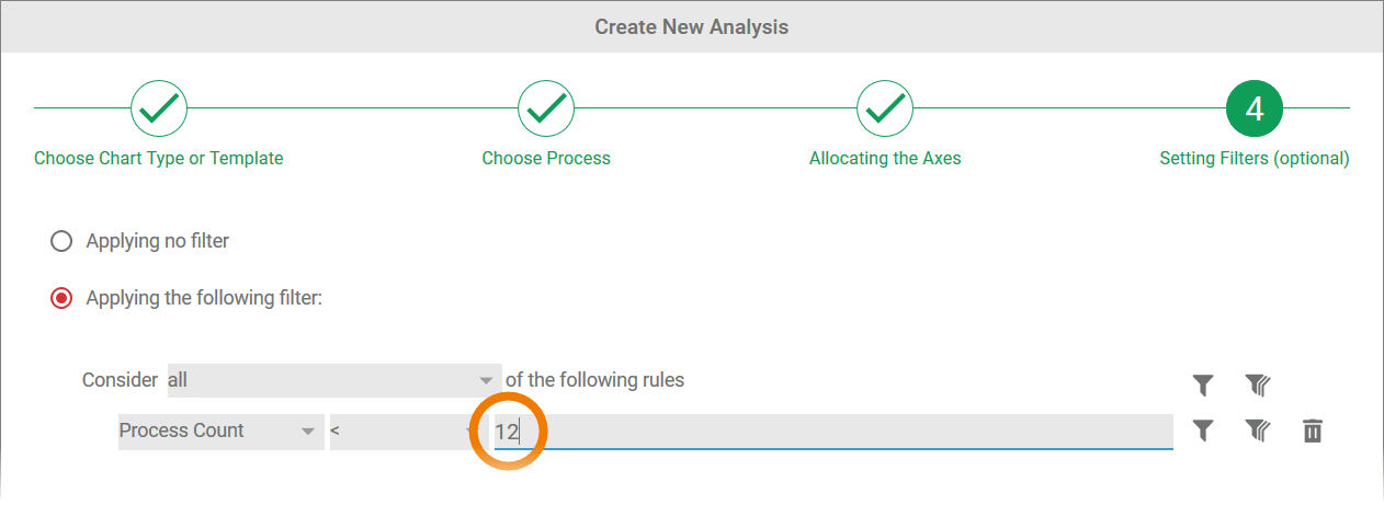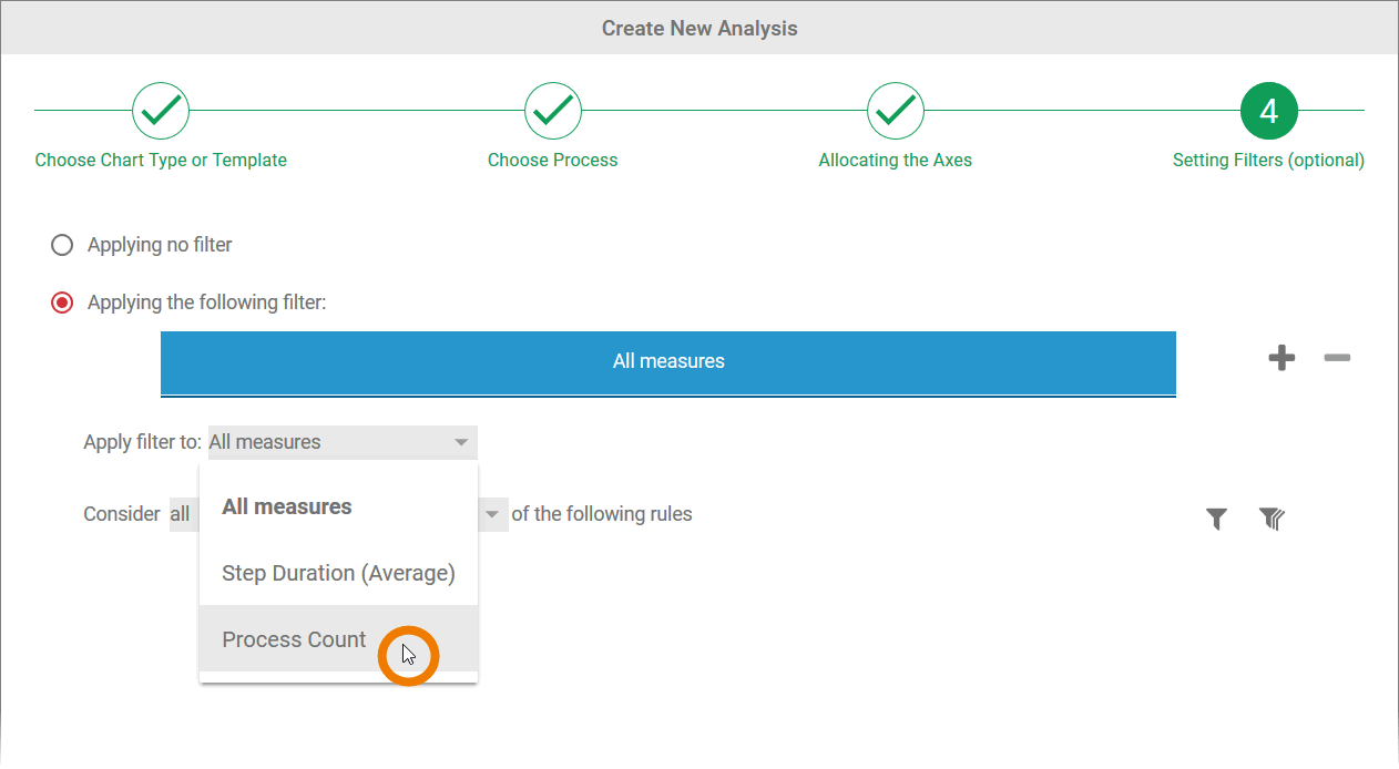 In step 4 of the wizard, the option Applying no filter is selected by default. This means that all instances of the process selected are evaluated in the analysis.