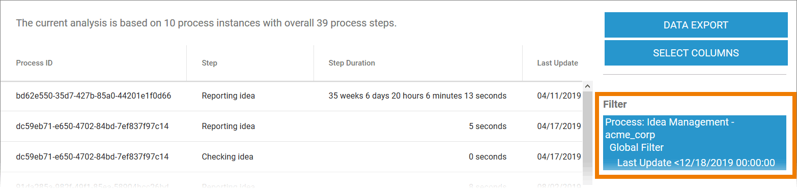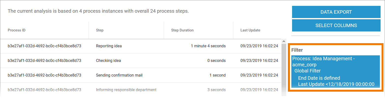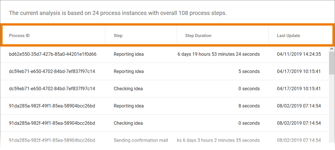 To enable identification of individual instances, the process ID is always specified as a column. Other features can be chosen freely by the user.