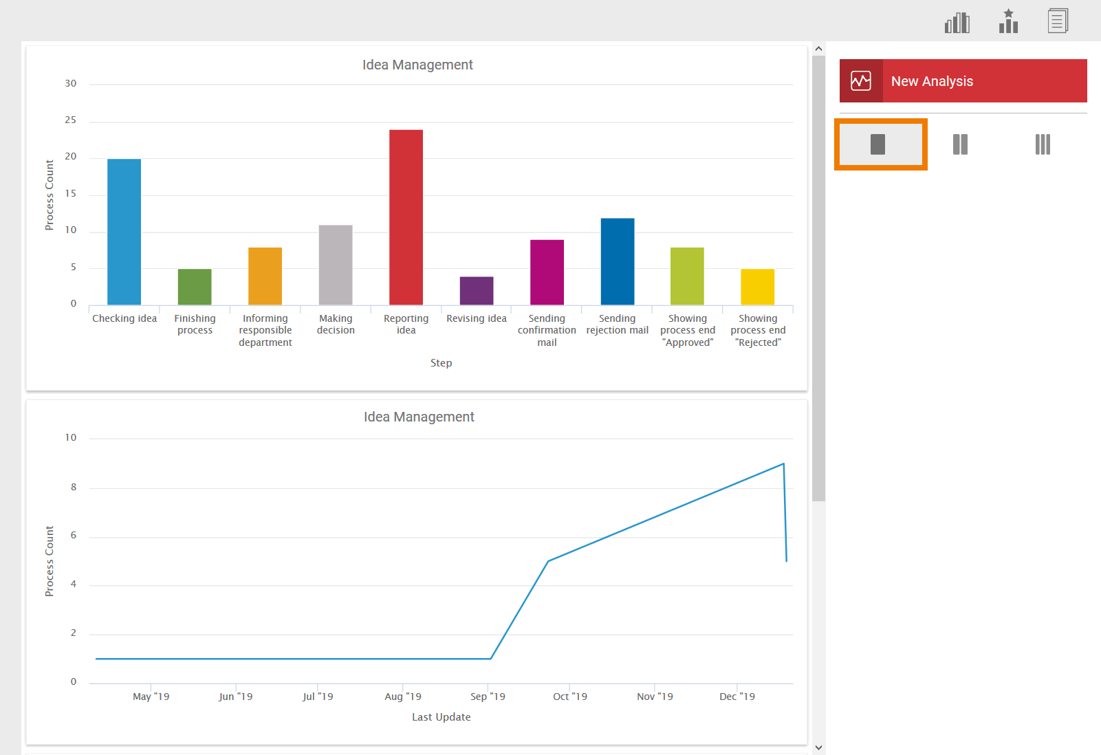 You can adjust the column layout of the Process Analyzer. Open the Analysis Sidebar to amend the layout. Use one of the three options in the sidebar: