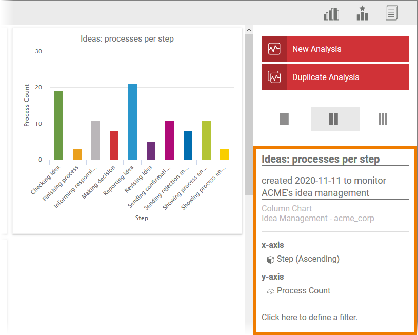 When you have created the filters you want, click Create Analysis to create the chart in the content area. The chart is created in the Process Analyzer. The analysis settings are shown in the sidebar.