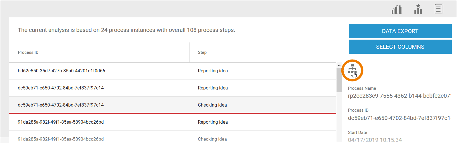 The charts are interactive. Click on a process step to show details of the instance for this step in the right hand column of the window. The detail view varies depending on the type of process step selected. The following details are shown: