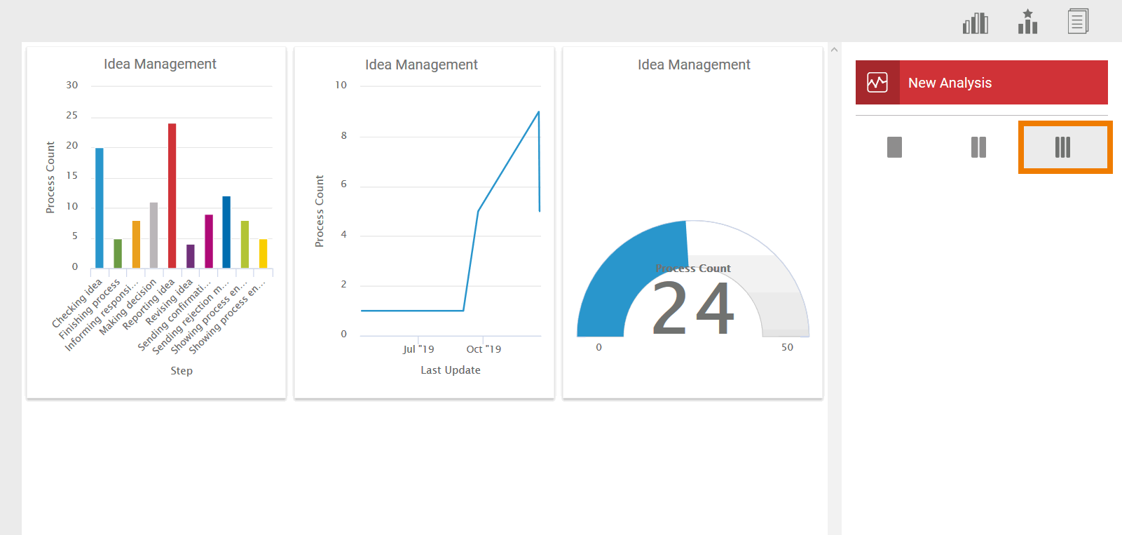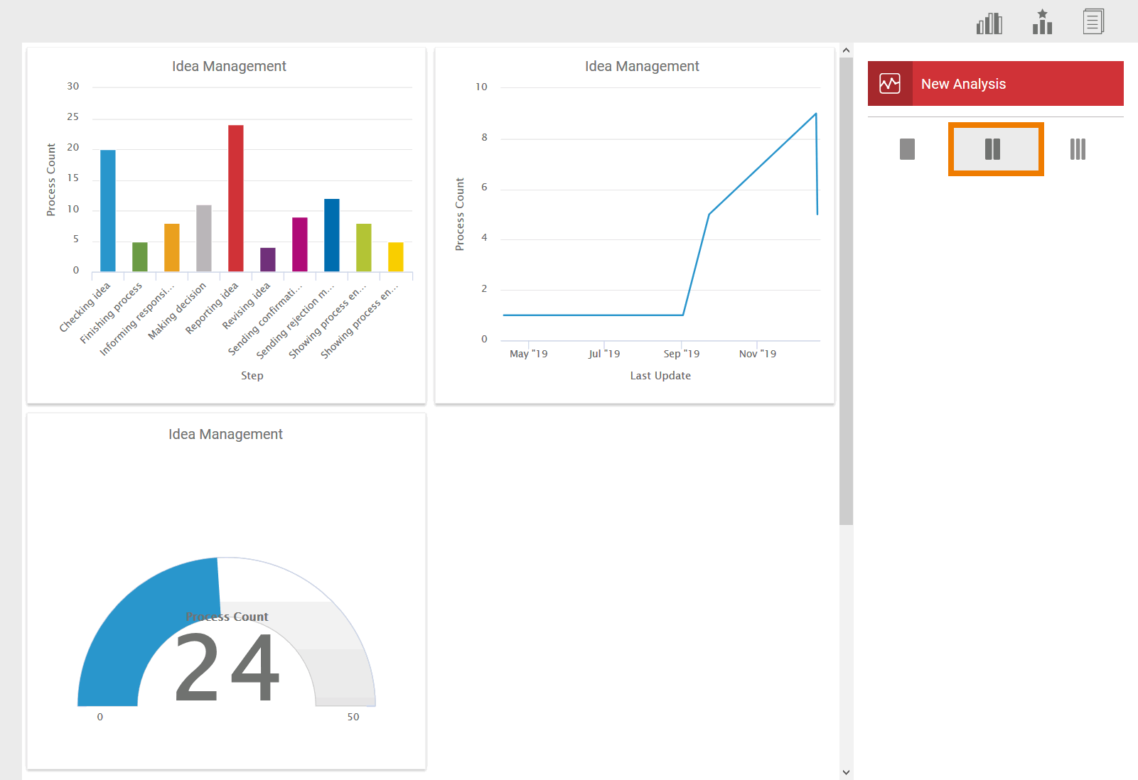 You can adjust the column layout of the Process Analyzer. Open the Analysis Sidebar to amend the layout. Use one of the three options in the sidebar: