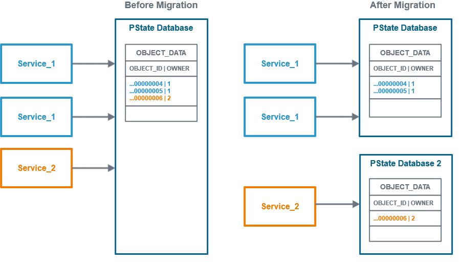 Currently it is technically possible (though not recommended) to share one persistent state database/database schema between different independent services. With future Runtime releases, this will not be allowed anymore.