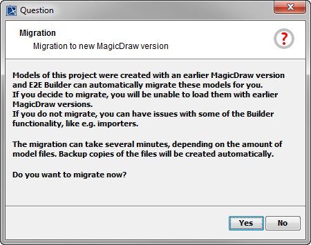 When opening a model in a Builder project that comes from MagicDraw 17 or MagicDraw 16.9, the Builder will offer to migrate this model and all other models within the Builder project:
