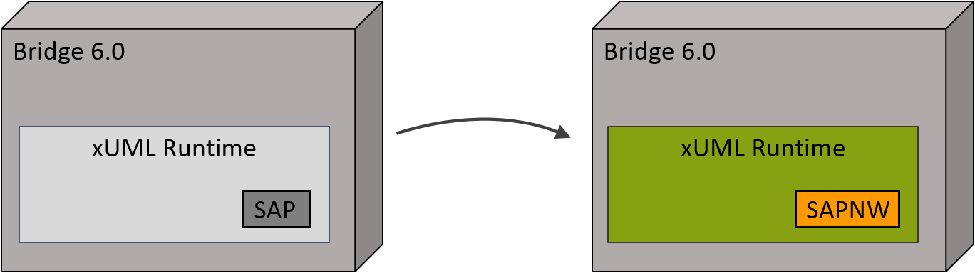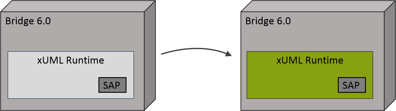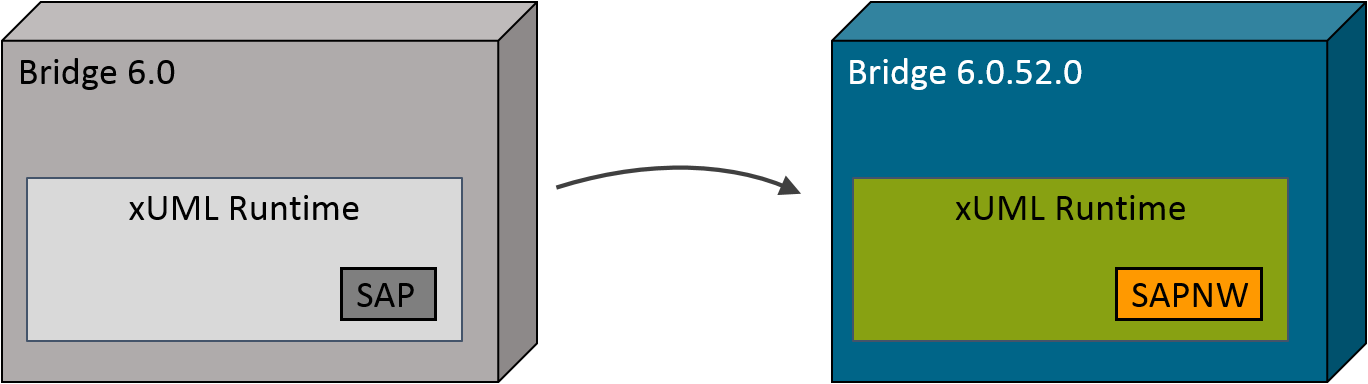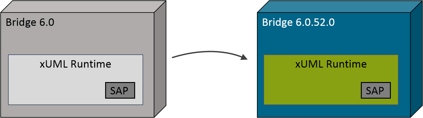Migration of Runtime only You have an SAP backend and services accessing it. You regularly update your SAP system and do not want to loose support for your SAP interface libraries, but you do not want to update your E2E Bridges except for the runtime SAP support.  | Update the xUML Runtime of your Bridge installation only. As of Runtime 2015.7, the xUML Runtime comes with the SAP NetWeaver package.